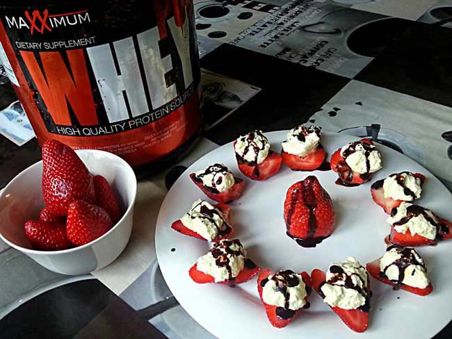 - Jagode operemo, jih prerežemo na pol in naložimo na krožnik. Stepemo smetano in ji proti koncu primešamo žlico beljakovinskega praška. Kokosovo maščobo stopimo, primešamo kakav in ohladimo. S kremo nadevamo polovičke jagod in prelijemo s kakavovim prelivom.